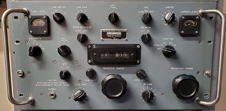 R-392/URR - The R-392 was designed to be part of the Army GRC-19 Transmitter-Receiver package that used the Collins-designed T-195 Autotuned 100 watt Transmitter that was often installed in Jeeps for mobile T-R operation. The R-392 was a scaled-down, somewhat miniaturized, portable, water-proof version of the R-390 receiver. To eliminate the need for a dynamotor that would have added extra weight and taken more space than was available, the R-392 was designed to run entirely on +28vdc. There wasn't any high voltage used, even though the receiver was a vacuum tube design. No mechanical filters were used in the R-392 and only three band widths were provided, 8kc, 4kc and 2kc. The single 600Z Audio output uses a 10 pin twist-lock U77 connector. The R-392 was an excellent performing receiver for portable communications and was used extensively by the military. Several different contractors built the R-392s and it was produced from 1951 up into the mid-1960s. Despite its smaller size and cast aluminum housing, the R-392 still weighs-in at about 50 pounds. More details in Part 4. |