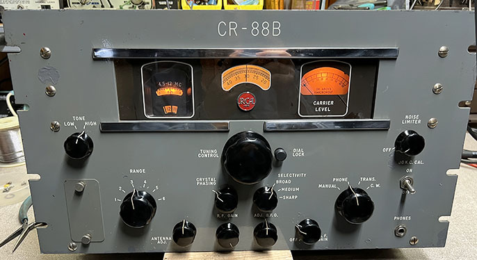 Tom has just finished the restoration of this CR-88B (12/24.) He was surprised by the lack of quality in assembly and in components used in the "B" when compared to the earlier versions of the AR-88 and CR-88. Of course, the first AR-88 receivers were built for the war effort where quality versus cost wasn't an issue. After WWII, the CR-91A receiver, built in Canada, used a cheaper gearbox that was prone to breakage. The Camden-built CR-88 seemed to maintain most of the quality of the wartime AR-88. But, the CR-88B apparently featured a lot of cost reduction features that included eliminating one of the IF amplifier stages. |