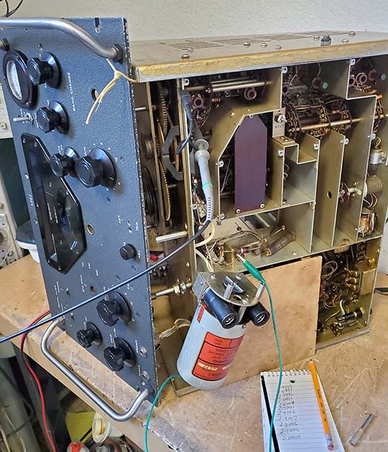 SN: M8656CR is the earliest PTO I've seen with both the "M" prefix and the "CR" suffix. It was found in a 1953 contract R-388 with a SN: of 1713. The "M" certainly looks like it was added after the numerals (ink doesn't match.) The "CR" is stamped which is also odd. The PTO SN of M8656 seems plausible for a 1953 contract R-388 but since this receiver wasn't inspected "in person" it's impossible to tell if this PTO is original to the receiver. The next PTO is SN: M-10816 C.R. and this PTO was found in a 1957 contract R-388. Notice that the chassis doesn't have the Iridite and MFP coating and is like the 51J-4 chassis. The PTO SN: M11254C.R. is the highest "M" serial number I've seen that has the "M" prefix and the "C.R." suffix, so far. Unfortunately, only the PTO exists so the specific receiver it was removed from is unknown (although it's certainly from a 1957 or later contract R-388.) As to why it has both the "M" prefix AND the "C.R." suffix are on these PTOs? Unknown at this time. One could speculate that the "CR" indicated that the newer RC34 ferrite core was installed and the "M" indicated the PTO was going into a late contract R-388 receiver. NOTE: PTO SN: M11254C.R. was tested and found to have an EPE of 15kc! Nowadays, predicting which particular type of 70E-15 PTO will exhibit excessive EPE is probably impossible. Interestingly, I was able to recalibrate this PTO to have an EPE of <1kc and with a linearity deviation of about 1kc. This was accomplished only using the L002 trimmer adjustment. This PTO had the highest EPE I've encountered and was then able to recalibrate to specs just using L002. Not too surprising for a "CR" PTO. This PTO was probably from a 1957 contract R-388. |