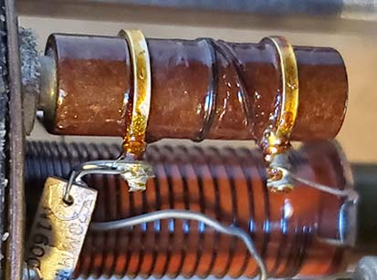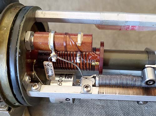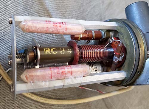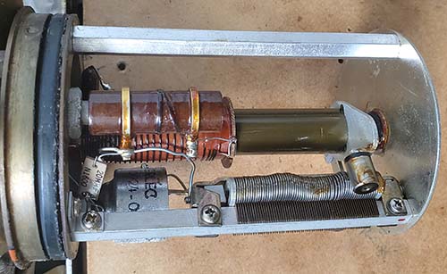 >>> Expecting any negative-pressure seal to last 70 years and maintain a vacuum is probably wishful-thinking. However, I've found several "C.R." PTOs that still have the hex plug sealed with green Loctite indicating that L002 was never accessed and the vacuum may have been preserved much longer than the typical "M" PTO. ALL of these CR-type of 70E-15 PTOs were easily adjusted for <1kc EPE just using L002. Evidence seems to indicate that field calibrations of the PTO followed by not returning the PTO to Collins for reworking is the primary cause for excessive EPE. As further evidence, I've also successfully calibrated a stock but "sealed" "M" PTO (SN:M6653) indicating that loss of vacuum and air-moisture ingression is the primary cause of uncorrectable EPE problems. Another scenario is that perhaps slight differences in construction and components between the "M" PTO and the "CR" PTO actually prevents the "CR" PTO EPE from ever increasing to the point where it can't be recalibrated just using L002. Photographic Evidence - A side-by-side comparison of the internal structure of a "M" and "CR" version provides some interesting speculation since there are virtually no differences that visually stand out. Here are some things noticed: 1. Ferrite core in the "C.R." PTO is identified as "RC 3 4" while the ferrite core in the "M" PTO has no identification. Both cores are dark olive green but this is usually just a coating of paint that protects the ferrite and prevents contact with the actual ferrite material (since it's conductive.) 2. Desiccant packs are installed in the "C.R." PTO but not in the "M" PTO. 3. Note the wide variability of the washer stack in the "M" PTO versus the almost flat washer stack in the "CR" PTO indicating that the "CR" ferrite material versus its position within the inductance is much more linear and perhaps a different permeability or mix of ferrite material. Conclusions - The most significant visual differences would be the desiccant packs in the "C.R." PTO and the fact that the ferrite core is identified in the "C.R" PTO. If the ferrite core is different in the "C.R" PTO (requiring identification) that would be a significant change that certainly could be the reason that the "C.R." can be easily calibrated just using L002. The ferrite material might also be responsible for the almost flat washer stack linearity adjustment. The lack of desiccant packs in the "M" PTO is a surprise since the earlier 70E-7A used in the 51J-1 and 51J-2 had a desiccant holder on top of the PTO. The difference was that the 70E-7A wasn't sealed where the 70E-15 was a sealed-vacuum environment. Speculation - The conclusion is that loss of vacuum due to field calibrations removing the hex-plug to access L002 resulted in air-moisture ingression. This was then followed by not returning the PTO to Collins for proper recalibration and sealing. The air-moisture contamination may have affected the ferrite causing it to change permeability to the point where L002 didn't have the range of adjustment necessary for calibration. These actions were probably responsible for most of the "M" PTO problems. The "C.R." PTOs found in 51J-4 receivers were not even calibrated very often and therefore the vacuum seal lasted much longer. Additionally, desiccant packs probably absorbed moisture ingression as the PTO seals aged. Perhaps a different type of ferrite, RC34, was less affected by the loss of vacuum and air-moisture ingression. The upshot is, expect nearly all early 70E-15"M" PTOs to be difficult or even impossible to calibrate while the 70E-15"CR" usually calibrates easily just using L002. Note in the photos below, the ferrite cores in the 51J-3 PTO and in the R-388 SN:9108 PTO are identified as "RC7." |