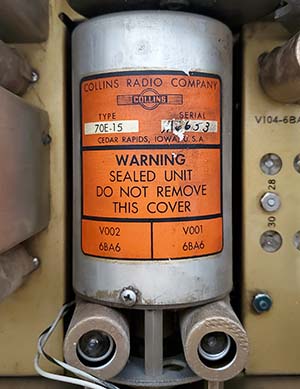 case showing rubber-cushion shock feet. Also the bottom and rear cut-outs 7. Close-up of one of the CY-1260/G side heavy-duty glide rails 8. Side louvers on CY-1260/G 9. Mil SN:161 is the assigned serial number for the Army Signal Corps and that's stamped on the data plate. Collins had their own "in house" serial numbers that were assigned when the receiver was built and put into Collins stock. This receiver's Collins "in-house" serial number is 9108 and that number is ink-stamped on the front panel (located under the data plate) and punch-stamped on the rear of the chassis. This photo shows the Collins SN: 9108 on the front panel along with the data plate Mil SN:161 on contract order 3362-PHILA-52. Date codes on components in the receiver show August 1953 as the latest date which indicates the receiver was built sometime after that date. And, note,...the receiver doesn't have a Break-in Switch so one assumes its pre-1953 manufacture, which it obviously isn't. Read more in the 2025 update below. 10. 70E-15 PTO SN: M6653 is a fairly high serial number to go along with the Collins Mfg SN: 9108. Read the 2025 update below for more manufacturing date information. |