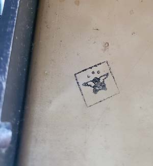 Stamps on Collins SN:9108: A - "Eagle in Circle" stamp on top rail back of front panel B - "Eagle is Box" stamp on side panel - there's one stamp on each side panel C - MFP stamp with no date and the punch-stamped Collins Mfg SN:9108 |