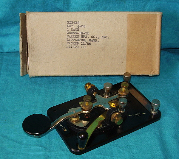 Corporation This J-38 was found in its original box and it, of course, is in near-mint condition. What is shown on the box indicates that it was packed 11/55 and had been built on a 1955 contract. The interesting thing is that the key base has the "L" embossed on the bottom indicating it's a "Lionel J-38" but the box printing indicates that it was built by Warren Manufacturing Company located in Littleton, Massachusetts. Reduced post-war demand for the J-38 must have meant fewer contracts were issued. Were there leftover parts made during WWII that were still available? Could Warren Mfg. Company have assembled these J-38s from surplus Lionel bases and other Lionel parts? Or, did Warren build new parts and copy the Lionel J-38 exactly,...right down to the "L" on the base? Another possibility is that Warren just repackaged surplus WWII "Lionel-built" J-38 keys. Whatever happened, the end result is a very nice hand key with an excellent feel and precise sending ability. Many of the WWII military transmitters used internal keying relays or sending relays that switched the antenna and receiver standby functions between transmit and receive as the key was operated. Although many military manuals will state that sending speeds can be over 20WPM, most of the time 15WPM is about the upper limit. This is mainly because of the relay's mechanical movement involved with the sending function. I use a J-38 key for most CW operations when using WWII vintage military transmitters. The J-38 just about can't be beat for the best "feel" and the best keying function when you absolutely must use a hand key. |