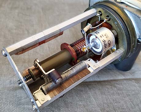 The "M" version versus the "CR" version - Nowadays, an "as found" 70E-15 "M" version,...that is,...the type only found in the early R-388 receivers (those built from 1950 up to about 1955,) will never meet its accuracy specification due to excessive end-point error that usually can't be corrected with the L002 trimmer adjustment provided. It was thought that the type or mix of ferrite used for the PTO core had aging problems that didn't show up immediately. However, the L002 L-trimmer was provided to compensate for "aging" changes that happened to all of the Collins PTOs. But, for some reason, it seemed that the 70E-15"M" PTO changed more than was expected. Just how long did it take for the calibration end-point errors to develop? It's very likely that the 70E-15 "M" EPE problems really developed into serious problems around the mid-1950s. Collins improved the 70E-15 PTO around the time that the 51J-4 was introduced. ALL 51J-4 receivers were equipped with a 70E-15C.R. PTO. These "C.R." versions seldom have an uncorrectable EPE and usually can easily be calibrated just using the L002 L-trimmer provided. Although the schematic never changed for the 70E-15 PTO, obviously something inside was changed to make the "C.R." versions maintain their calibration and their ability to be calibrated much longer. A visual examination of the "M" versus the "CR" interior construction will reveal no visible significant changes. A few minor differences are apparent when examining the PTO interiors "side-by-side." I've photographed the interiors of the "M" and the "CR" PTOs and the comparison photos are further down in this section. The last contract for R-388 receivers was a small one in 1962 but the majority of R-388 receivers, those built from 1951 up to about 1955, are considered the "early" R-388 receivers and those receivers exclusively used the "M" version PTO. Why "M" versions develop uncorrectable EPE - As it became apparent that something about the 70E-15 "M" was causing an ever-increasing number of PTOs to fairly rapidly develop "uncorrectable" end-point errors, meaning that the normal L-trimmer adjustment had insufficient range to bring the PTO back into specification, the first thought (by users and owners) was that the aging of an unstable mix used in the ferrite core was causing the problem. It should be pointed out that all types of Collins PTOs will change calibration over time and it was an expected aging factor. That's why the L-trimmer was provided. It's probably also why the 70E-15 PTO's internal components were "sealed in a vacuum" and why Collins insisted that PTOs that had been field calibrated must be returned to Collins for recalibration where the vacuum seal was the last step in the process before the corrected PTO was returned. However, the PTOs weren't returned to Collins very often and therefore most PTOs had their vacuum seal lost with the first adjustment for calibrating the PTO and thereafter the components inside, including the ferrite, were exposed to the air and moisture which could then cause "rapid deterioration" the PTO components inside (the quote "rapid deterioration" is directly from the Collins R-388 manual.) Could the uncorrectable EPE have been caused by the end user? - There weren't any documented internal changes made to the 70E-15 PTO. The schematics shown in 51J-3, R-388 and 51J-4 manuals are all identical. The only obvious external difference is that the 51J-4 regulated +150vdc was provided with better filtering with an added electrolytic capacitor and a "T" filter on the 0A2 regulator tube. This filtering change also shows up in the later R-388 receivers (1957 contracts.) Also, these later R-388 receivers have PTOs that show both the "M" prefix and the "CR" suffix on the same serial number, e.g., M11254C.R. or M10816C.R. Since there aren't any differences in the 70E-15 PTOs that can be shown on schematics, the difference must be something not visible, such as the type or mix of ferrite used in the cores of "CR" PTOs. But, for the "M" PTOs, it could also be that the differences were in how the receivers were used in the field. Collins believed that the problem wasn't something that happened to every 70E-15. It took a specific set of circumstances in the field and then a few years for the uncorrectable EPE errors to develop. While the ferrite core might develop a correctable EPE just by aging, the excessive EPE problem probably started the first time that the PTO was calibrated in the field with the removal of the L002 L-trimmer access hex-plug that then allowed air and moisture to enter the PTO. In their manuals, Collins even mentions the possible contamination that could happen with a field calibration "breaking the vacuum seal" and air-moisture ingression causing "rapid deterioration" of the PTO's internal components. In anticipation of possible vacuum-loss problems and knowing that most customers were not going to return their PTO to Collins for recalibration and resealing, starting with the "CR" PTOs, Collins included two desiccant packets inside each 70E-15 "CR" Since the problem was almost always with the "M" PTO in R-388 receivers, it seems that the operational environment, where the R-388 receivers were often turned on 24/7, could also have been a factor, perhaps accelerating the deterioration of PTO components after the vacuum loss. Collins certainly wouldn't have put too much time into analyzing a problem that they essentially corrected with the "CR" version of the PTO in 1955. In fact, after 1954 and up to 1962, a total of only about 1000 R-388 receivers were built on just a few military contracts in those eight years. And, the 1957 and later R-388 receivers have more 51J-4 characteristics (including the "CR" added to the serial number of these later PTOs) making these late-R-388s significantly different than the early-fifties R-388s. Collins did produce a write-up specifically on the 70E-15 PTO around 1959 but exactly what is covered in that docum