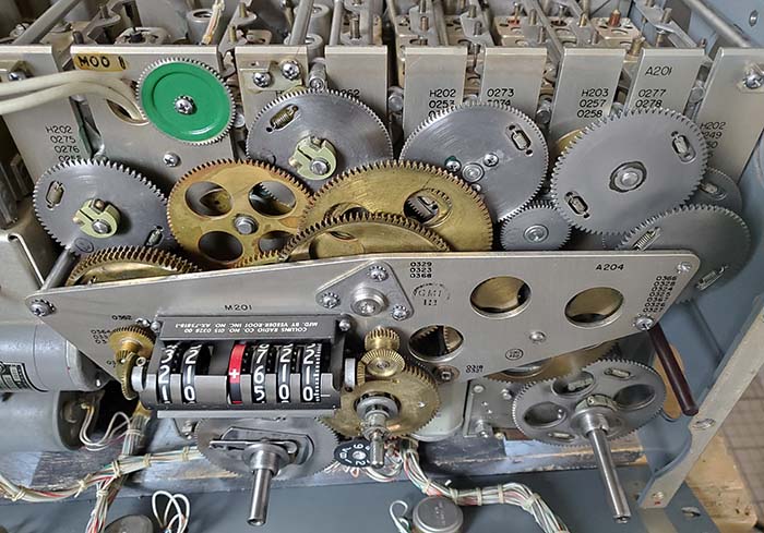 Mechanical Details - The manual tuning of the receiver RF front end uses clutch-coupled gears to rotate the main RF tuning shaft that has worm gears that perpendicularly engage and rotate the gear-driven front and rear line shafts that have worm gears that in turn engage gear-driven vertical screw-shafts (cut with forward and reverse threads) that raise and lower the various slug racks. This gear-driven system seems like it would be fairly heavy to manipulate but with proper (lightly oiled) lubrication it operates with no more effort than a good condition, clean, well-adjusted R-390A gear box. Since the frequency ranges span a great deal of the spectrum (and this requires a lot of knob-turning) a clutch-coupled, motor-drive tuning system is provided. A separate motor-drive system is employed to operate the bandswitch. There are specific frequencies, that as the receiver is tuned past that frequency, the motorized bandswitch operates and automatically changes to the next higher or lower band as required. The Veeder-Root counter is somewhat different than that used in the R-390 and provides two sets of digits, one for 15kc to 500kc (lower set) and the other for 500kc to 1500kc (upper set.) The resolution of the digits (tuned f) is to the tenth of a kilocycle (which are the red background digit wheels.) Neither a calibration oscillator or an antenna trimmer are provided (or needed.) >>> |