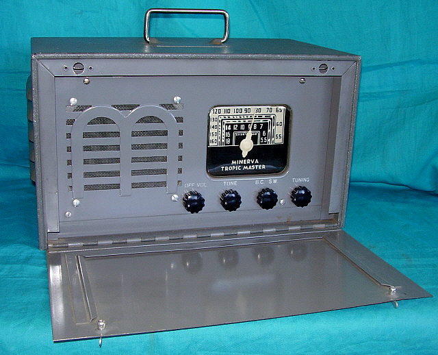 Minerva Corporation of America - W117 "Tropic Master" The Minerva Tropic Master is an eight-tube receiver that covers AM-BC and provides one Shortwave band, 5.5mc to 18mc (there are some minor variations in the shortwave coverage with different production runs.) The cabinet is metal and features a fold-down front cover along with a carrying handle. The Tropic Master is an AC-DC powered receiver. There were two circuits used with the earlier version having push-pull 50L6 tubes and a series-parallel filament string. This version could also be modified to use two 25L6 tubes by changing the filaments to series making the entire string a series load. NOTE: The schematics in Riders VOL. XV have several errors including the 50L6 filament connection. The later circuit uses two 50A5 tubes and a 35Z5 rectifier. The P-P audio seems a bit much for the small built-in PM speaker. Four controls provide Volume and ON-OFF, Tone, Band Select and Tuning. The rear panel of the cabinet has a door to allow access to the power cord and the antenna terminals. The Tropic Master didn't have enough shielding to be used onboard ships as the LO leakage would have exceeded the minimum acceptable level of 400pW on whatever antenna was used with the receiver. Minerva advertised that they had supplied the Tropic Master to the military (both Navy and Army) as a "Morale Radio" - that is, a radio primarily for entertainment in barracks or other shore locations. Apparently, a few Tropic Masters did serve in that capacity as there seems to be enough first-hand accounts to believe Minerva's advertising was essentially true. Certainly though, the majority of Tropic Masters were sold post-WWII. The selling price was $75 and many were sold out of the PXs at various military bases during late-1945 and through 1946. The Minerva W117 schematic in Riders' VOL. XV is dated June 1945 and this data shows the two different versions that are documented. There are apparently other minor variations that were incorporated into the receiver circuits but these were not documented.