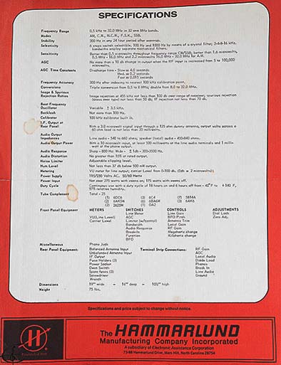 Right: This is page two (back side) of the R390A flyer from EAC/Hammarlund showing receiver specifications. Easily seen at the bottom of the page is "The Hammarlund Manufacturing Company Incorporated - a subsidiary of Electronic Assistance Corporation" with the location being Mars Hill, North Carolina |