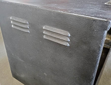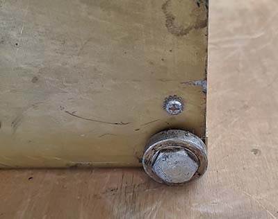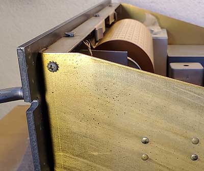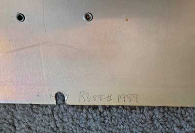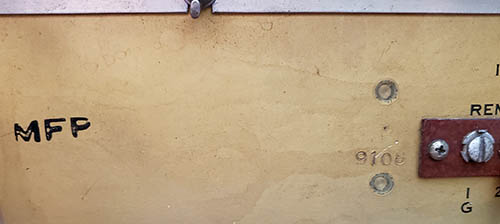 This close-up of the Collins Mfg. SN and the data plate area of the front panel shows that the original paint is still inside the data plate mounting holes. This area of the receiver is very important because it's obvious that a data plate has never been mounted here. Normally, when a data plate was installed, the wrinkle finish paint near the screw holes will be compressed. This results in the paint around the screw holes looking "glossy." So, observing that the paint is still in the screw holes and the wrinkle finish hasn't been compressed, no data plate has ever been mounted to SN:1999 which indicates the receiver wasn't a R-388 when it left Collins. |