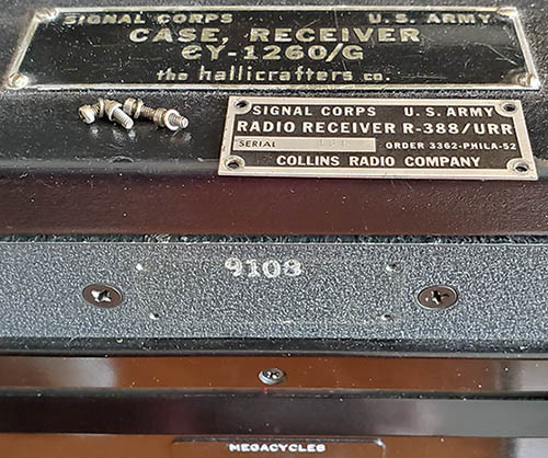 | Knobs and Tubes - Since this R-388 was a "basket case" it naturally didn't include all of the knobs or many of the tubes. Luckily, I had a complete set of Daka-Ware knobs that had come with the "parts set" 51J-2 receiver. I did have to search through the junk box to find a set of Daka-Ware kilocycle and megacycle skirted knobs since those weren't on the 51J-2 "parts set." Most of the tubes missing were the 6BA6 tubes. In fact, the R-388 uses seven 6BA6 tubes. Also, missing were the two 6AK5 tubes, the three 6BE6 tubes, the 6AQ5 and the 5V4 rectifier. All tubes were found in the tube "junk" boxes. All tubes used in the R-388 should test well above "minimum acceptable" for best performance. | Repro ID Tag - As can be seen, this receiver originally had two data plates installed that had been removed in the past. The center tag was the serial number identification plate and the tag to the right was a "Caution" tag that informed the user to refer to the TM manual. Luckily, there are a few repro tags available from Mike Chanter (Collins Radio Association.) He supplies a 1950, 1953-54 and 1957 type tags. Since this R-388 was probably built on a 1951 contract, I should have gotten the 1954 tag but instead I bought the 1950 version. The thinking was that the MFP date of "JAN 52" would have to be from an earlier build, thus the 1950 tag. However, knowing that Collins built R-388 receivers an put them into inventory for later contract sales, maybe the 1953-54 tag would have been a better choice. NOTE: THE original data plate was obtained, or was it?. |