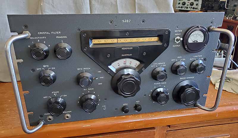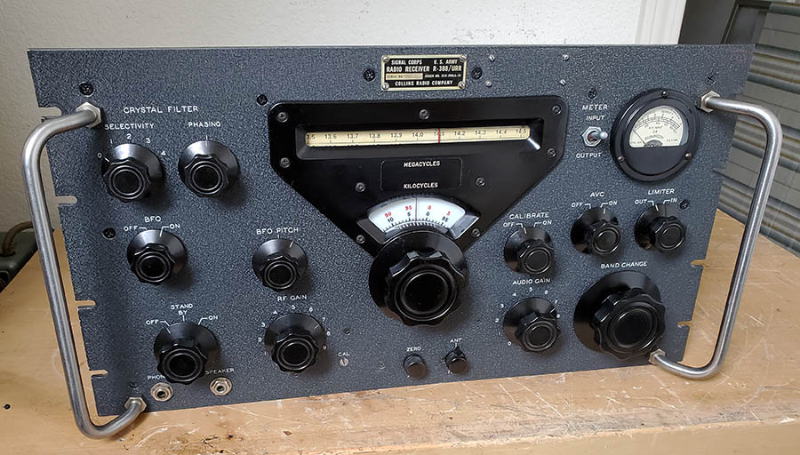 relief is a Heyco 6T.) photo left: The R-388 "basket case" immediately after restoration (Oct 2013.) Those aren't the correct grab handles. The meter is a Marion Electric field replacement. See below for updated photo of this receiver |