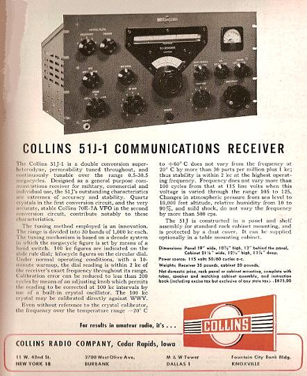 Collins had been developing the 51J general coverage receiver since 1944. It seems unlikely that the 51J-1 receiver was available in 1946, concurrent with the introduction of their ham receiver, the 75A (to become the 1947 75A-1 when the noise limiter was added.) It's probable that a few prototype 51J-1 receivers were being developed into marketable receivers by 1947. Sometime in the late-1940s, Collins sent a few 51J receivers to the Signal Corps for testing and evaluation. The first advertisements appear in 1949. Since the 51J-1 was the introductory version, several changes happened along its very limited production history that more than likely ran from mid-1948 through all of 1949 and up to early 1950 when its successor was introduced, the 51J-2, which was available through all of 1950. >>> |