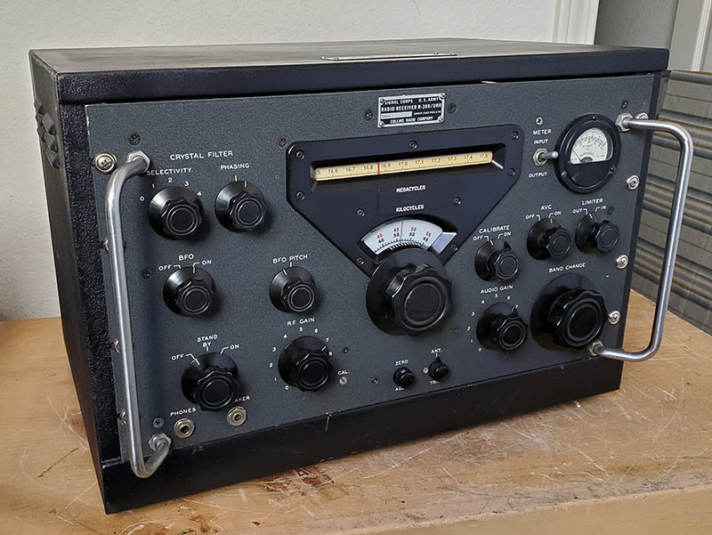 Towards the end of 1950, the R-388/URR was introduced, featuring an 18 tube circuit (adding a voltage regulator 0A2 and VFO buffer 6BA6,) a new version of the PTO (70E-15) and eliminating the fixed 300 Z ohm antenna input (by removing the primary winding on the antenna coils) and redesigning the antenna input to a more flexible design utilizing an Antenna Trim control. This revision was probably at the request of the Signal Corps, who wanted to use the new version of the receiver for their RTTY installations but found old 51J antenna requirements of a fairly Hi-Z, "fixed" (non-adjustable) 300 ohm antenna input impedance difficult to work with since most of the Army installations used either 75 Z ohm dipoles or 50 Z ohm (or less) vertical whip antennas. The new upgraded receiver was designated as the R-388/URR (when going to the Signal Corps) and it was built from late-1950 through about 1954 in relatively large quantities. There were also later contracts for 1955, 1956, 1957 and 1962 but the total quantity in these four later contracts is only about 1000 receivers. It's commonly believed that from 1950 through 1962 somewhere around 12,000 R-388/URR receivers were produced. PTO serial numbers imply that over 11,000 R-388/URR receivers were built which seems to confirm the estimated total production. All contracts were built by Collins Radio Company although in the early 1950s Hallicrafters supplied a couple of special types of military cabinets along with R-388 receiver manuals that came with the cabinets. These Hallicrafters cabinets and manuals are probably the source of the erroneous "Hallicrafters-built R-388" myth (Collins wouldn't even let RACAL build 51J receivers.) Some (possibly all) of the U.S. Navy R-388/URR receivers were designated as AN/URR-23-A (but were identified as "R-388" on the Navy data plate) and this set-up included the receiver installed in a Collins table cabinet (designated as CY-1235/U) and a Collins 270G-3 speaker (designated as LS-199/U.) Additionally, the USAF had Raytheon supply them with a few modified receivers that were designated AF-30 (R-645) and were used for backscatter ionospheric purposes. These USAF receivers had a blue front panel that lacked the standard grab handles (these receivers actually were 51J-3 receivers modified by Raytheon.) The largest contract quantities for R-388/URR receivers are from 1951, 1952 and 1953 contracts. Careful examination of the various R-388 data plates will show several different "order" numbers within each year. There were at least seven different order numbers used in 1951 and at least five different order numbers used in 1952.