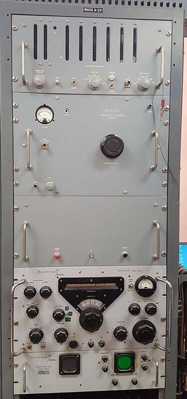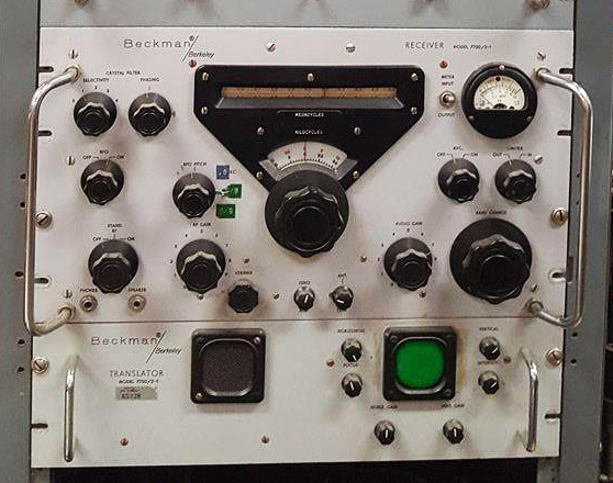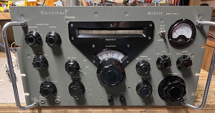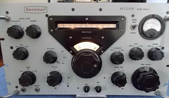 Light-Gray Panel 51J-4 - The most often heard reason for the light-gray panel 51J-4 were that they were for use in laboratories or in test facilities. Some say that they were for Collins "in-house" labs (and evidence seems to confirm this.) But, did Collins supply light-gray panels to other end-user laboratories? See Receiver Model 7700 next. Were light-gray panels ever advertised as an option? I don't think so. Receiver Model 7700 - This identification is on the Beckman-versions of the 51J-4 with light-gray, smooth-finish painted front panel. One Beckman/Berkeley 51J-4 has been found with a greenish-gray wrinkle finish panel with identification as Model 7700/3. Various "/xx" suffix to most Model IDs, e.g., Model 7700/2-1. Some of the Model 7700 receivers were components of a Beckman Frequency Measuring System. The Model 7700 receivers had several modifications incorporated into the circuitry so they could function as needed with the other Beckman equipment. Beckman did all of the modifications to the receivers and probably made the panels themselves. It seems probable that Beckman purchased standard 51J-4 receivers from Collins and then incorporated all of the modifications themselves including the new light-gray front panel with Beckman logos.