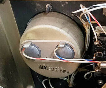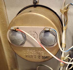 The BAND CHANGE knob had a crank handle that was mounted at the outer edge of the knob. It's possible that the crank style changed during production (see "pull-out" crank on the 51J-2 further down.) The CALIBRATE nomenclature was originally going to be 100KC CRYSTAL and that was on the initial prototype 51J-1 receivers that were used for artwork that was used in advertising (see 1949 ad in History section above.) When the 51J-1 went into production the 100KC CRYSTAL nomenclature was changed to CALIBRATE (I've never seen any 51J-1 receiver that had the 100KC Crystal nomenclature.) The CAL. was a fine adjustment trimmer for the 100kc crystal oscillator (the wide-range adjustment was on the chassis.) ZERO ADJ. was a mechanical adjustment of the KC dial fiduciary index for precise frequency readouts or measurements. The 51J-1 audio response was "communications grade" with a low end of 200hz (at -6db) and a high end of 2500Hz (at -6db.) A .01uf capacitor was installed on the primary of the audio output transformer for impedance matching and transient suppression and this tended to "roll off" the high frequency response and that left the audio sounding somewhat "muffled" when listening to voice or music transmissions. However, most of the restricted audio response is due to the IF section and its very narrow bandwidth of 4 to 5kc at -6db down. Except for changing the value of the .01uf capacitor to 6800pf in the R-388, which resulted in slightly different specifications (200hz at -3db to 2500hz at -7db,) no significant changes were made to the audio output stage for the entire 51J Series (but, also starting with the R-388/51J-3, small value capacitors of 2pf were installed across the IF transformers, primary to secondary, to increase coupling and that also broadened the bandwidth of the IF section.) The 51J-1 and J-2 receivers can be tuned to either the upper or lower sideband when in the AM mode to increase the audio highs. The audio output transformer provided a 4 ohm impedance audio output and a 500 ohm impedance audio output. With the R-388/51J-3 the 500Z was changed to 600Z. The loudspeaker described in the manual has the dimensions and specifications of the Collins 270G-1 though it isn't identified with its model number. The power transformer used for the 51J-1 was a frame-type, vertical mount transformer. The frame-type power transformer was painted gray. This frame-type was changed to a potted power transformer by the 51J-2 production. The audio output transformer also was a frame-type vertical mount that was changed to a potted transformer by the 51J-2 production. Remote Standby was accessed from a terminal strip on the rear chassis and parallels the front panel Standby switch position. The ham bands were high-lighted in green on the megacycle drum dial but, at $875 list price, not many hams could afford a 51J-1 as their station receiver (if you wonder why few hams bought the 51J-1, $875 in 1949 was equivalent to $11,150 today in 2023.) Incidentally, the $875 price did include a table top cabinet for the receiver, if so ordered. Otherwise, a rack mount configuration was supplied. The 51J-1's chassis layout is slightly different when compared to the later receivers. The most obvious difference is the four tubes in-line at the left-rear corner area of the chassis (viewed from the front of the receiver.) On the 51J-1 and early 51J-2, the IF transformers were in-line, front-to-back, but were more forward on the chassis. This allowed space for the four in-line tubes that comprised the Detector, AVC, NL and Audio Output functions. The tubes used were three 12AX7 tubes and then the left-most tube was the 6AQ5 audio output tube. Also, this layout resulted in the 1st IF amplifier tube (6BA6) being located directly under the MC drum dial which made removal of that tube difficult. This layout was changed during the 51J-2 production (beginning with 51J-2 sn: 501.) Another difference is the location of the fuse holder next to the 5V4G rectifier tube. This fuse location was changed during the 51J-2 to the more conventional rear chassis apron location. Also, the filter capacitor is a fiber-board mounted, multi-section electrolytic capacitor (the plug-in filter capacitor was introduced with the 51J-2.) There may have been a black cardboard tubular cover over the filter capacitor. Yet another difference was the crystal oscillator tube (V-5, later V105) that originally was a 6BA6 but was changed to a 6AK5 during the 51J-2 production. A close-up photo to the lower left shows the "four tubes in-line" left rear corner of the receiver chassis along with the fuse holder mounted next to the 5V4G tube. |