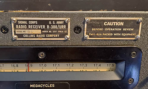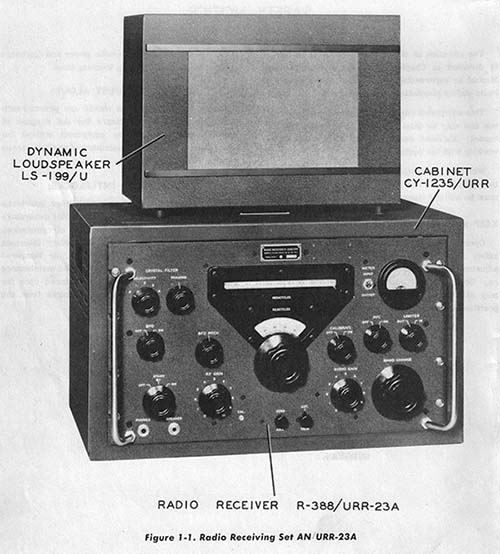 R-388A/URR and R-388B/URR - With this designation, these receivers should have been Signal Corps receivers. These are versions of the 51J-4 but it's unknown if the data plate actually identified the receiver as a "R-388A/URR." Same with the R-388B. At this time, no examples of a receiver identified by the data plate as "R-388A/URR" are known to exist (navy-radio.com also indicates the lack of any known examples.) The designation is shown as "R-388A/URR" in Federal Procurement Books. It could be that this was just an identification for ordering the 51J-4 receiver and the receivers shipped from Collins may have actually had the "51J-4" designation on the ID tag (or maybe no data plate at all.) Since the R-388A/URR was shown in Federal Procurement Books as a purchasable receiver (purchase price was about $1200,) the implication would be that it was a new receiver. As for military conversions using the Collins 354A-1 Mechanical Filter Kit, there doesn't seem to be very much evidence that this conversion was performed in military depots. The common use of "R-388A" to describe a R-388 with the 354A-1 installation is of amateur origin and not an official designation. AN/URR-23 and AN/URR-23-A - These are U. S. Navy designations for the 51J-2 and 51J-3 installed in a Collins cabinet designated as CY-1235/U with Collins speaker designated as LS-199/U. According to the USN manual for the AN/URR-23-A, the receiver IS a R-388 and this is shown many times throughout the manual. Also, three artwork pictures show the data plate which identifies the receiver as "R-388" only, no "/URR" and the data plate has a USN contract number to the lower left of the tag. It's possible that the AN/URR-23-A identification was on the data plate that was mounted on the CY-1235/U cabinet. The LS-199/U loudspeaker also had a data plate installed. The contract was issued for the AN/URR-23-A on June 22, 1951.