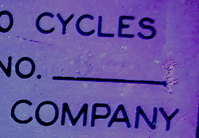 environment. The photo to the right shows the serial number area under UV. The "6" is fairly obvious but the other digits are all but gone. I put the image into "Photoshop" and there I could enlarge it and use different filters to bring out the second and third digit. Although very faint, with the enlargement capabilities of "Photoshop," the "top half" of a "5" can be seen and then perhaps a "2." The idea of photographing the serial number under UV light and then uploading into "Photoshop" was a major help since I could manipulate the image for best results. It's also very likely that different wavelengths of UV might show ink residue better. You do have to be careful when using some wavelengths UV, don't look at the UV light directly and wear UV protecting glasses. Also, don't look at reflected UV light for long periods of time. Just take a photograph and then examine the results in "Photoshop." |
